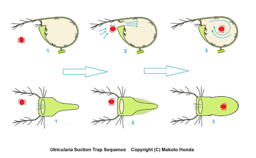 Perangkap tipe suction tidak kalah dramatis dengan snap trap, bahkan proses pemangsaan tipe perangkap ini berlangsung sangat cepat. Utricularia merupakan marga kelompok tumbuhan karnivora yang memiliki suction trap. Mekanisme pemangsaan dimulai dengan memompa air hingga di luar perangkap. Ketika mangsa mendekati perangkap dan menyentuh rambut-rambut pemicu, perangkap akan terbuka dan menghisap mangsa tersebut dengan sangat cepat.